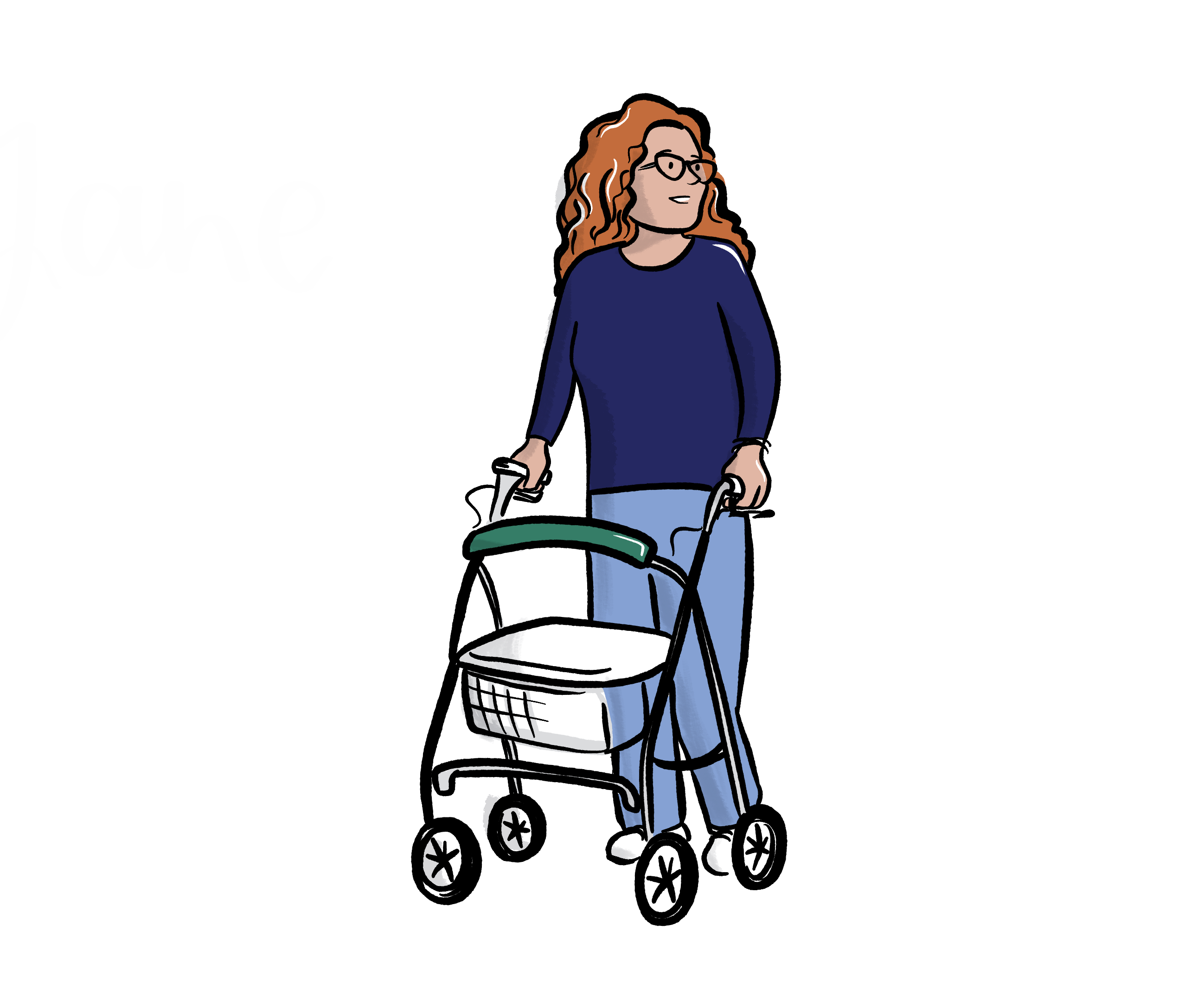 Jane's cognitive impairments impact her ability to follow instructions, remember information, sequence tasks and learn new skills. Jane requires a 4-wheel walker to move around her home. A manual wheelchair is needed to move longer distances in the community. She needs assistance from another person to ensure her safety when mobilising at home and in the community.